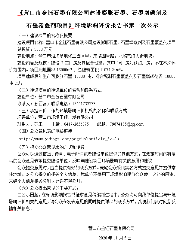 《營(yíng)口市金鈺石墨有限公司建設(shè)膨脹石墨、石墨增碳劑及 石墨覆蓋劑項(xiàng)目》環(huán)境影響評(píng)價(jià)報(bào)告書第一次公示